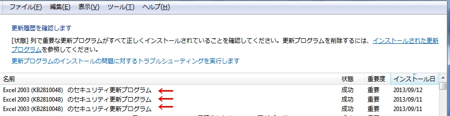 要は↓な症状です。 あ、OSはWin7(SP1)です。 赤矢印で表示したとおり、同じものが延々と落ちてくる現象が発生してます。 更に向かって右の常態を見ていただければお判りのとおり、DLやインスコに失敗した訳でもなく延々と落ちてきて当ててきやがるという地味な嫌がらせ。 公式がエラーの存在を認めてる(※ちょっとスクロールすると中の人の回答あり)と、「数日中に何とかするから一度落ちてきたら安心してね(意訳」って公式に近そーな所@詳細がいってるんで、取り敢えず鬱陶しいなら右クリックで非表示にして、気にならんなら黙殺で対応待ちしかないようです(´・ω・`) // 調べたらWinXP(SP3)でも発生する模様 >>蛇足 OSがWin7なのにOfficeが2007でなく(賞味期限切れ寸前の)2003なのは、95から延々と引き継いでる一部のデータが現役(爆)なのも然る事ながら、太古の昔(ぇ)に仕事してた時2007の大改悪で発狂し掛けたから(白目 2k移行時にちょぼちょぼ保存し直したりして大半の現行データは2k>2003と互換してるから、ぶっちゃけてしまえば後者が原因だ(キリ 期限切れ起こしたもんを使い続ける事が危険なのは判ってるんですが、あのリボン形式たらいうのを辞めるまで意地でも使い続ける事になろうかと(悲壮感 つか2007はまだ何とかなると思うけど2010とか絶対無理ぽです(;´Д`) // 最近のは画面変えるパッチがあるらしいけど実際どーなんだろ? PR |