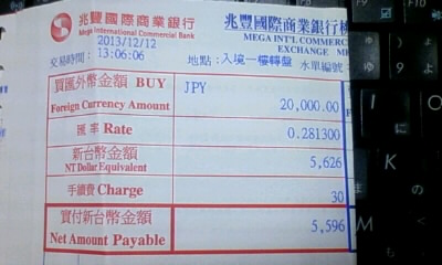 どんだけフライト時間が有利だっても、二泊三日じゃあ買出s…じゃない、買い物が限度です(´・ω・`) それでも執念で茶葉を追加購入した挙げ句 胡椒餅を食すこの往生際の悪さ(ぉ >桃園国際空港までの道程 ~そうだ、バスで行こう まぁガイドブックに載ってるんでわざわざ小記事捏ねる必要があるのか如何かって話ではありますが、参考までにちょこっと小記事作成。 入国時は“証拠書類”を極力多く確保する為に高鐵を利用しましたが、帰国時は特に拘りもないし前日お世話になった茶荘の大将から「その時間帯なら高速バスを使った方が早いよ」ってアドバイスを受けたのもあり、素直に高速バスを使いました。 ルートによって複数のバス会社が存在してますが、台北車站を基点にするならば西ターミナルA棟から出てる國光客運の一択となります。でもって台北市内を巡行する他社と異なり、この國光客運の高速バスは空港直行。 京站(Q-Square)のターミナルと異なりこの西ターミナルA棟から出てるバスは限られてる上、そもそも行き先ごとに販売カウンターが分かれてるんで、カウンターに行って必要なチケットの枚数を伝えるだけでおk。あと空港行きに限ってひっそり自動券売機が存在するんですが、私が買おうとしてた時は壊れてたらしくお金を飲み込んでくれませんでした(´・ω・`) 切符を確保したら乗り場へGOです。 航空会社によってターミナルが違うんで、もぎりの人に利用する航空会社を訊かれたら素直に答えましょう。あとトランクに荷物を預ける際、クレームタグを兼ねた引換券を渡されるんで失くさないように。コレがないと預けた荷物を受け取れなくなります。 台北市内から桃園空港までの所要時間は1時間ほど。國光客運に限った話じゃありませんが、本数が多い高速バスの座席は行き先を問わず大体全席自由なんで、荷物を預けて適当な席に座ればあとは時間切れに歯軋りしつつ寝てればそこは空港という次第。 ただ、運が良ければ台北市内から高速を使わず、淡水河西岸を通過する事がありますんで、そうなると規制の厳しい台北市内とはまた違った車窓を楽しむという事も可能と相成ります↓ 押さえられた画像はコレ1件だけですが、他にも味わい深い眼福が彼方此方に点在しておりました(ニコッ >ぼっちが(往生際悪く)二民を満喫したようです ちょいと時間が読めなかったんで早めに台北を切り上げた訳ですが、新北市内も一部“混雑”程度で空港まで1時間と掛からなかった為に、予想以上に時間が余ってしまいまして(ぉ 明らかにチェックインカウンターが開放される前で、18元の筈なのに何故か15元で売られてた蘋果日報を買い うっかり食べ忘てた小南門の豆花を食すのみでは時間を消化し切れずorz チェックインも偶さか見付けたセルフの自動チェックイン機(※パスポートを読ませたら搭乗便の情報が出てきた上に座席指定までできる優れモノw)でやっちゃったんで、受託手荷物の預け入れが解禁されるまで手持ち無沙汰になりました。 で、カウンター開放直後に速攻荷物を預けてイミグレを突破し そのままマッサージ屋に走り 金柑ジュースで喉を潤してもなお余る時間を優しく抱き込んでくれた5番ゲート待合室の長椅子がこちら↓ 極楽浄土は5番ゲートの待合室にあったぞ!(`・ω・´) …とまぁ往生際悪く空港でヒャッハーした訳ですが、“機内食分”だけ胃袋を空けたんで流石にここで小吃を突っ込めなかったのが心残りといえば心残りですね。 あと真面目な話>ちょいと困ったというか戸惑ってしまったエスカレータ↓ 不鮮明で申し訳ないんですが、画像はバスの降車場のあった1Fから出国ロビーのある4Fを繋ぐエスカレーターです。 私が知る限りですが、日本だと大きなスーツケースを持ってエスカレーターに乗れない空港が多い訳ですが(その代わりエレベーターが大きい)、桃園はスーツケースやカートを持った状態でのエスカレーター移動が可能です。明らかにでっかいスーツケースを持って移動する為の配慮で実際非常に便利だと思ったんですが、引っ張ってるスーツケースがぱっつんぱっつだと重力に引っ張られてスーツケースごと転げ落ちそうになるのが困りモノ(爆 ええ引き摺られて転げ落ちそうになりましたorz ツアーだと4F直行のケースが多いんですが、何らかの理由で1Fから入るなどしてこのエスカレータを利用する際は、重い荷物は身体の前に置くといった対策が必要かと(;´∀`) >ぼっちの決算報告 両替結果の検証と通信費。 【そのいち:両替の結果を晒す】 2.台湾銀行総行@台北市内↓ 3.VISA@高鐵桃園站↓ 兎にも角にも一般的に台湾だと「カード決済が一番有利だ」というのが通説だったんですが、この数値を見るだに今回は如何やら銀行で両替した現金を持ち歩いた方が有利だった模様。 あ、蛇足ですが12日の高鐵桃園-台北間の切符を除き、帰国直前のマッサージ代も含めて全てキャッシュだった訳ですが、それでも手許に二千元近く残りました。流石に独りで一万元over