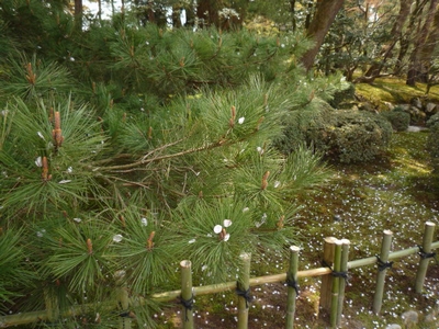 近場にある樹から散った桜の花びらがあちこちに散ってる訳ですが、この松も例外なく。